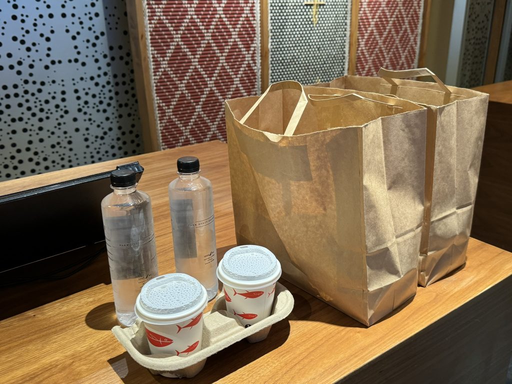 凯悦给我们准备了早餐,有热茶和两瓶水,我们自己包里还放了4瓶…有三明治、水果杯、香蕉、猕猴桃、橘子、还有焦糖希腊酸奶
